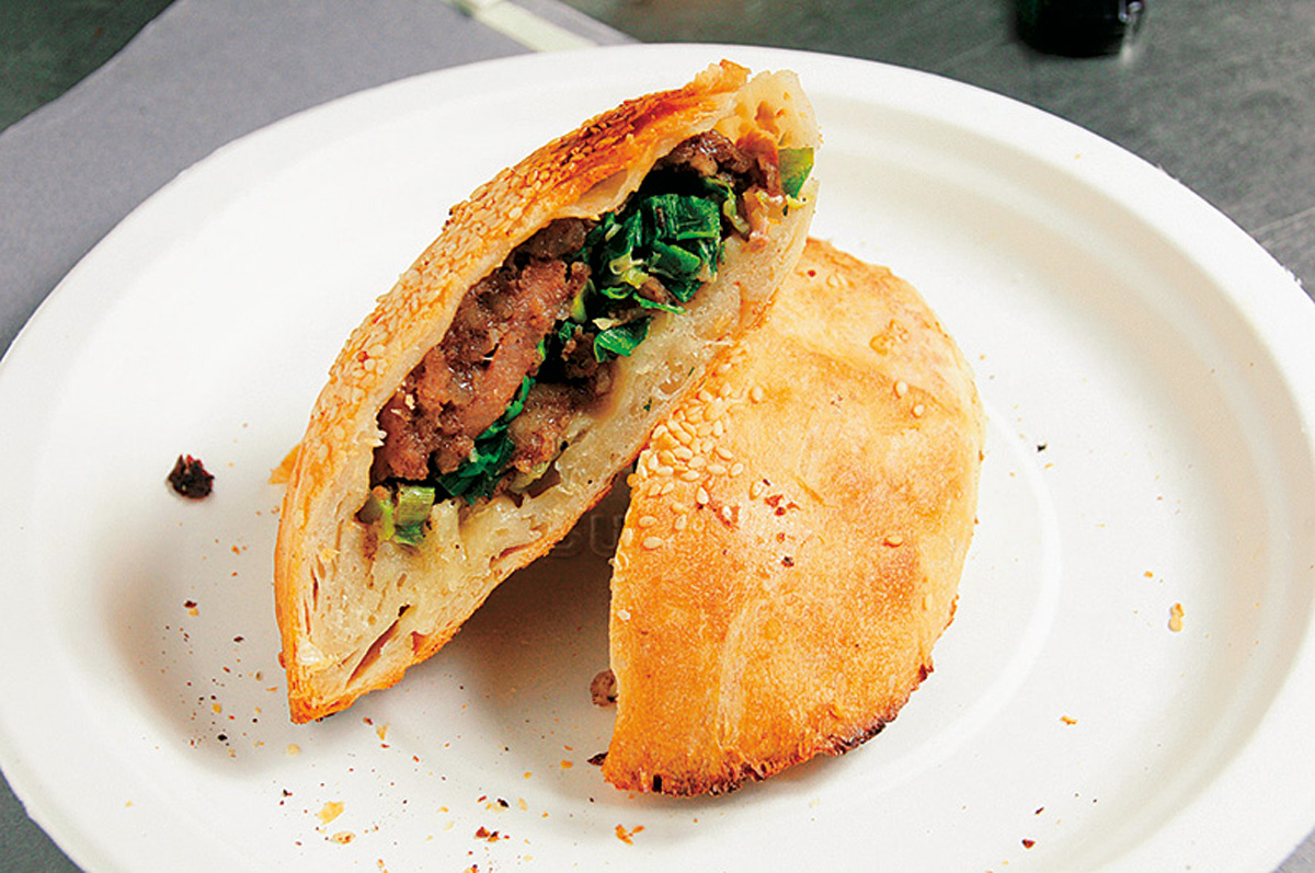 饒河街名物! ピリ辛のこしょうが効いた豚ひき肉とネギが入った焼きまんじゅうNT$50 。