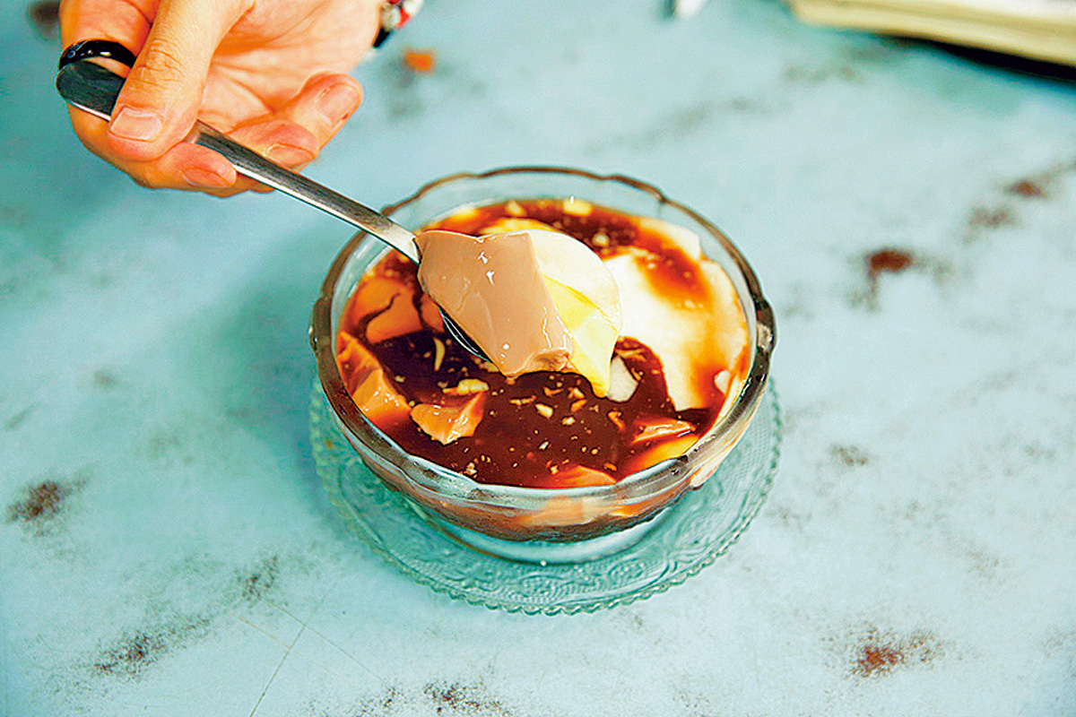 ココア、ミルク、卵味と3色の豆花が入ったカラフルなスイーツNT$40。脂の濃い食事のあとなどに最適です。