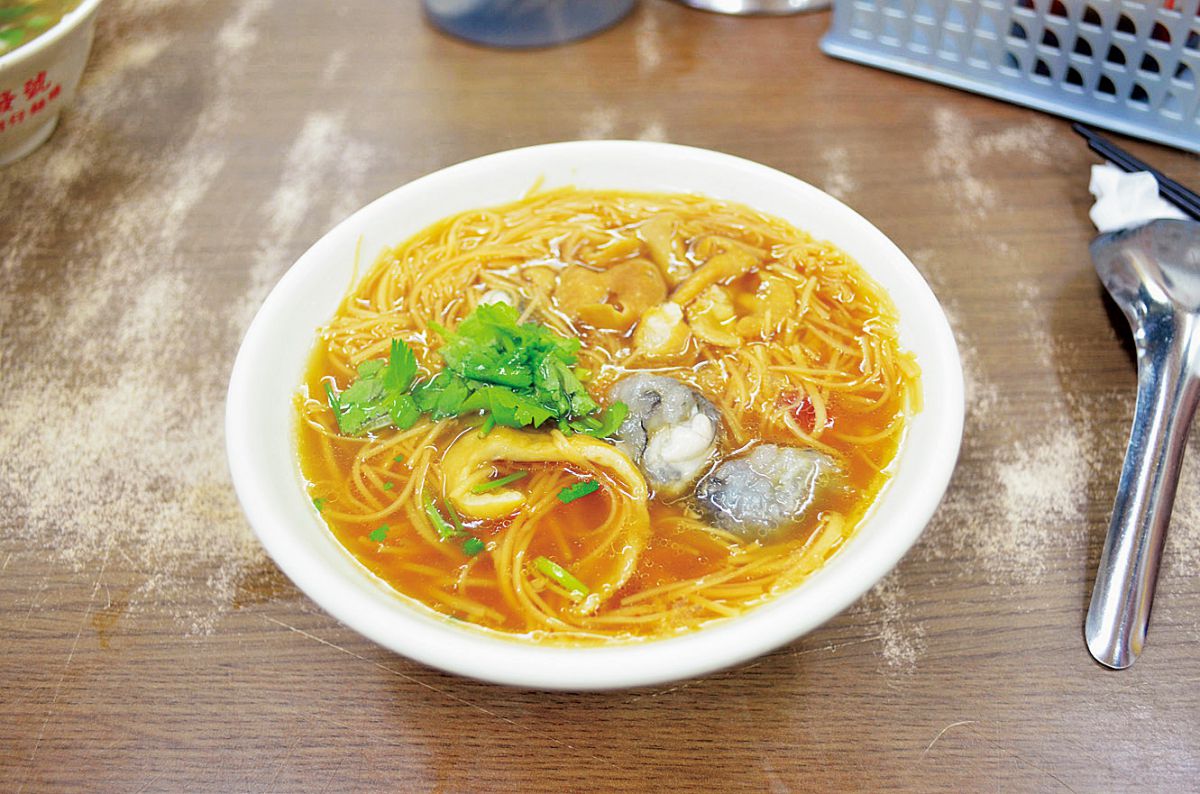 カキ、モツ、パクチーが入った甘いとろみのあるスープの台湾にゅうめんNT$65。店舗は福徳祠の裏側にあるので要注意です。