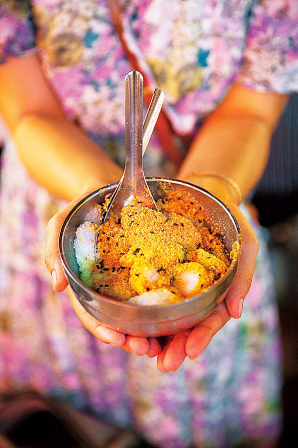 練乳ミルクかき氷にほんのり温かな、やわらか餅とピーナッツ粉、ごまをトッピング。NT$45