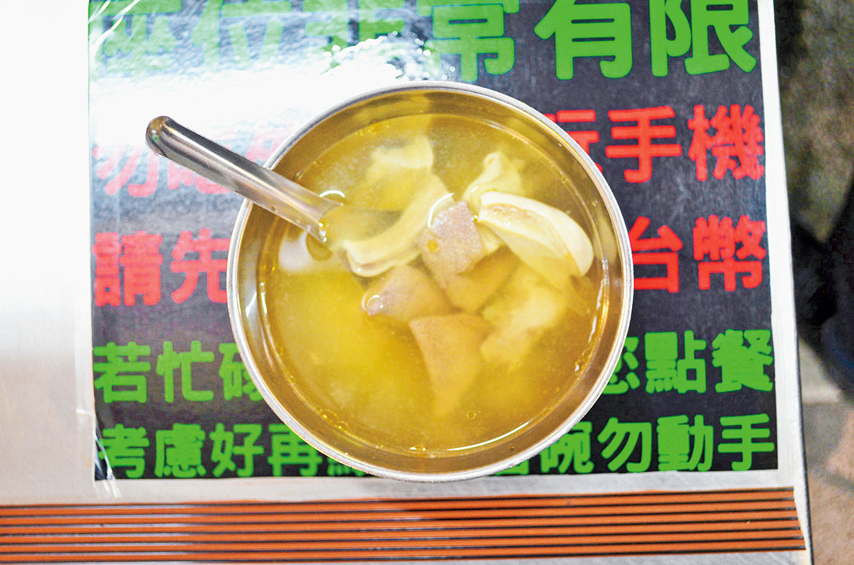 ガツ、レバー、肉つみれのあっさりスープNT$65。座って食べる場合は、店の後ろ側に並びましょう。
