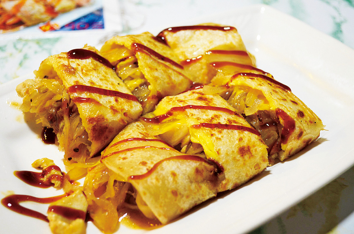 鉄板で焼いた鶏肉と玉ネギ、チーズをうすいクレープ状の生地で包み、ソースをかけたものです。NT$70