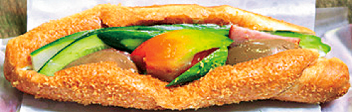 揚げパンでトマトやキュウリ、ハム、煮卵をサンド。いろいろな食感が楽しめます。