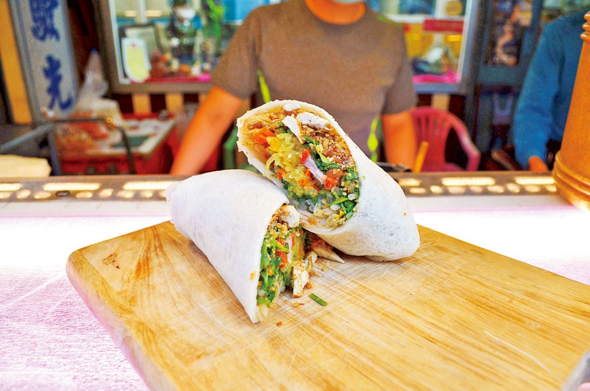 松青潤餅の潤餅(NT$50)は紅焼豚肉、温野菜、油條、ピーナッツの粉などをモチモチの皮で巻いた具だくさんの春巻!