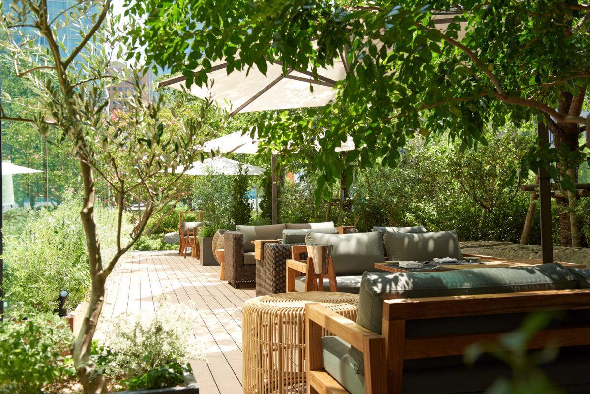 本格イタリアンと豊富なワインメニューを提供する「神楽坂 スタジオーネ」。テラスラウンジにはソファ席が配されており、神楽坂の町並みを望みながら、優雅に過ごすことができます。スタイリッシュかつ開放的な、魅力あふれる空間。