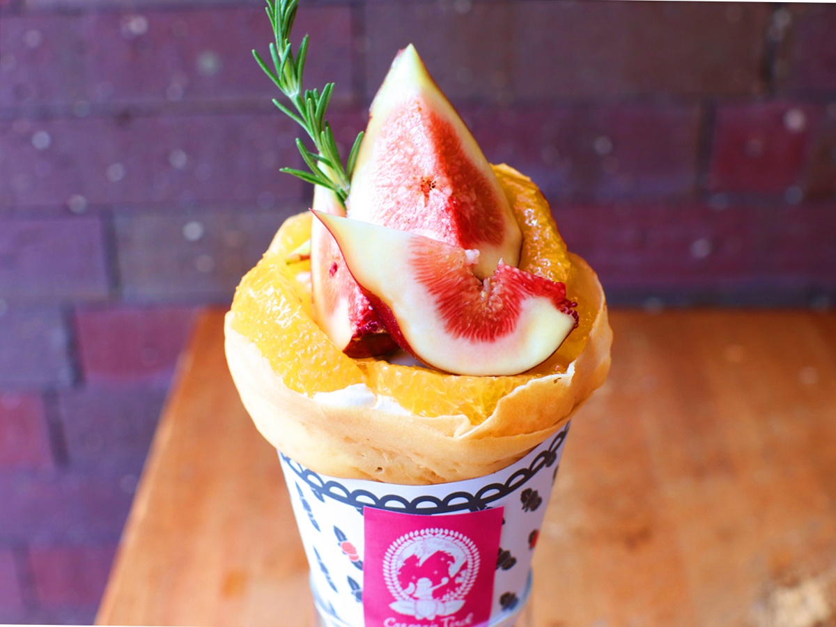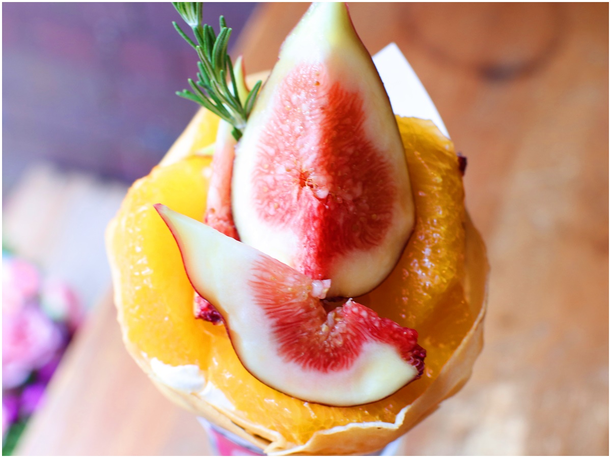 こちらのクレープのなかには、無花果、いちじくジャム、オレンジ、クリームチーズ、くるみがアレンジされていますよ。