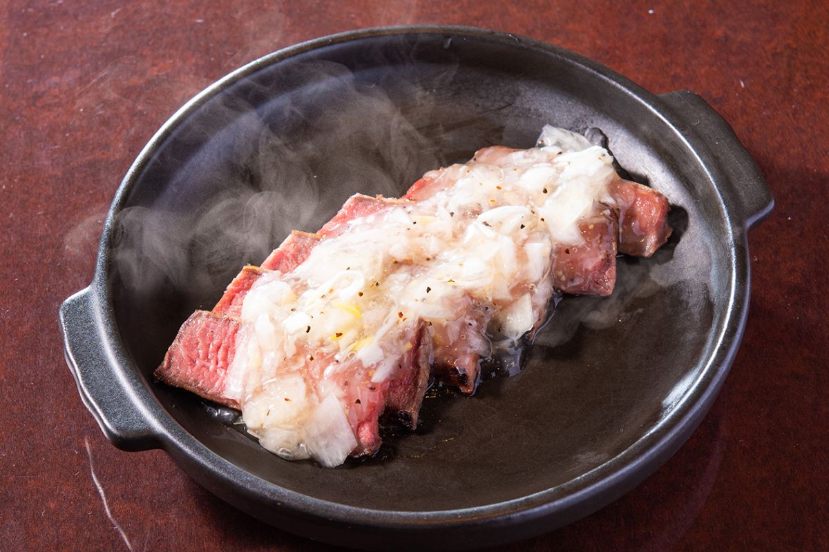 『淡路島と喰らえ』の「淡路牛のリブロ―スステーキ~淡路島産玉ねぎのねぎ塩だれ~」1200円。淡路牛のリブロースに、甘味が自慢の淡路島産の玉ねぎをたっぷり使った塩だれをかけて召し上がれ。