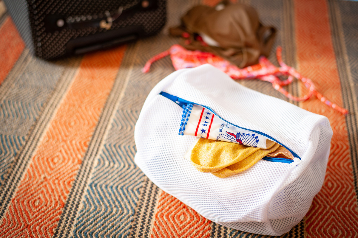 意外にも、洗濯ネットは重宝するアイテム。衣服を入れる整理袋として持っていき、着用後はランドリーボックスとして使用して、帰宅後、そのまま洗濯機に放り込むことができます。荷ほどきの作業が簡略化されるのは、うれしいですね。また、ちょっと厚手な洗濯ネットを選ぶと、クッションがわりになり、割れやすいお土産も衝撃から守ってくれます。かさばらないのに一つで何役も果たす、優秀なアイテムです。