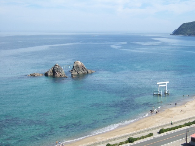 サンセットもおすすめ!エメラルドグリーンの海に映える大鳥居と夫婦岩