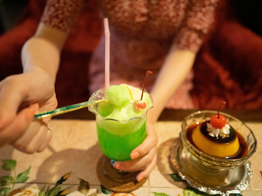 色鮮やかなメロンクリームソーダと、カラメルソースがたっぷりかかったプリン。どちらもさくらんぼがちょこんとのった、昔ながらの喫茶店スタイルです。店内の雰囲気とマッチした、美しいコントラストにうっとり。