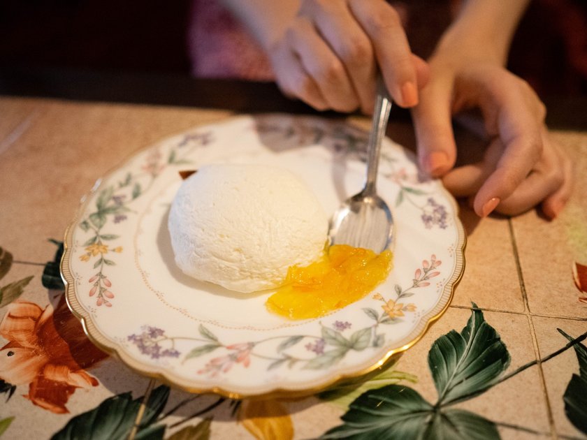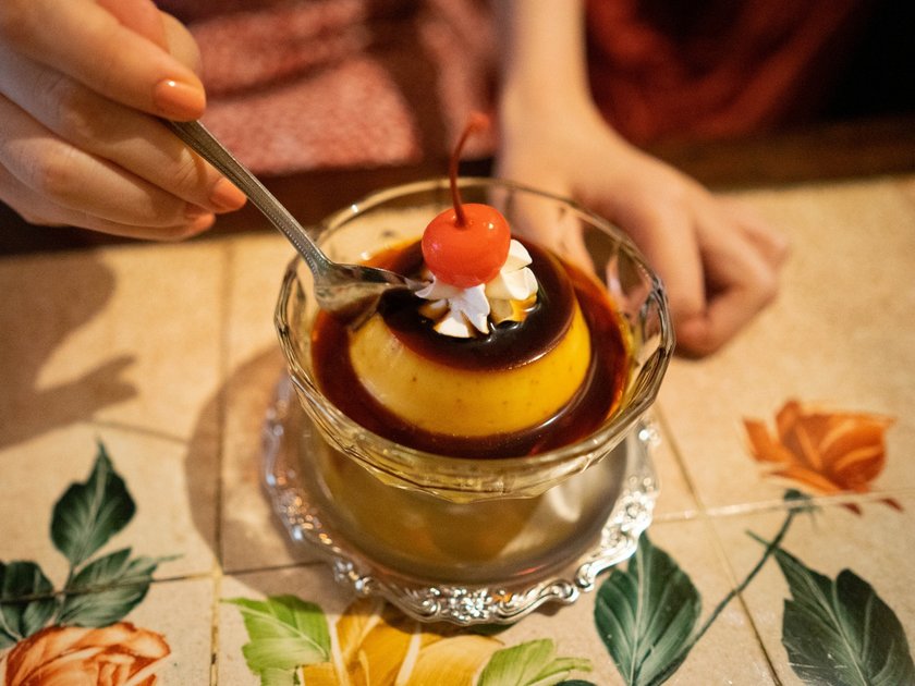 また、たっぷりかかったカラメルソースは、ほろ苦くて大人なお味。惜しまずしっかりかけていただくのがおすすめですよ。ほろ苦いカラメルソースの香ばしさと、さっぱり甘いメロンソーダは相性抜群!ぜひセットでお試しください。
