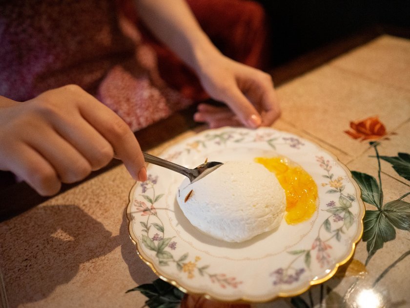 この不思議なチーズケーキは、フランスの「クレームダンジュ」というチーズケーキを参考に作られたものだそう。すくった感じはしっかりとしたムースのようです。