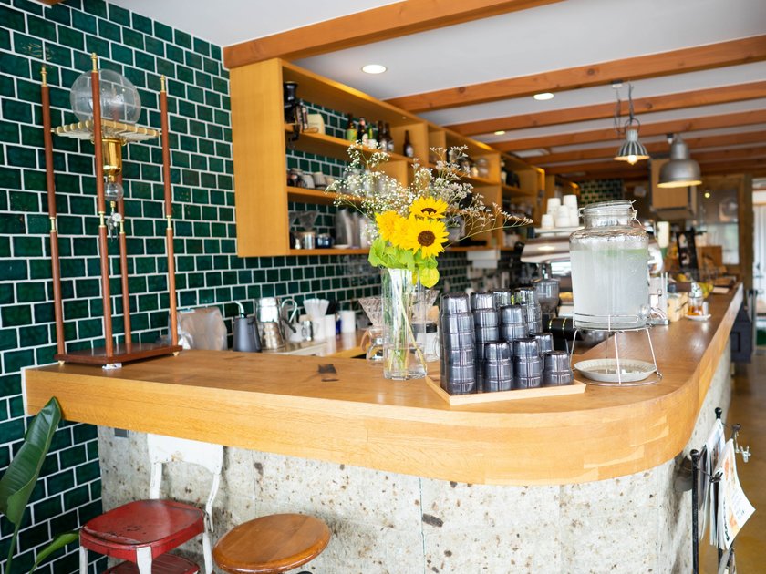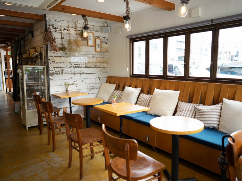 店内はソファのブルーがアクセントになった、ナチュラルな内装。席数は全部で10席です。