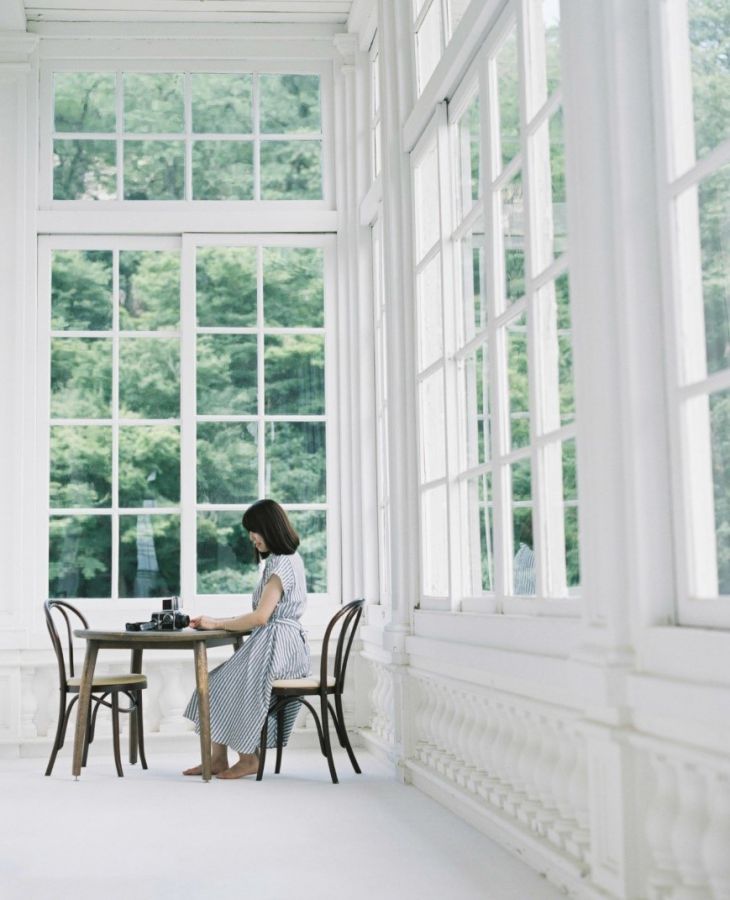 窓も天井も床も全部白色。外のグリーンが入って爽やかですね。