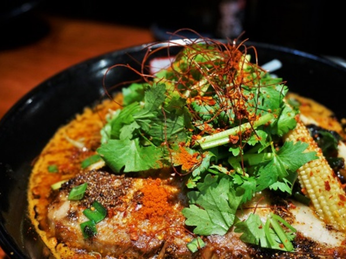新高円寺駅からほど近い場所にある総合レストラン「鉄板焼き&拉麺dining 麺昇 神の手」。今回ご紹介するのはこちらのお店で人気の四川風辛味噌ラーメン「神の手 赤」です!麺は4種類用意されており、メニューによって使い分けるほどのこだわり。唐辛子の辛さと山椒のしびれが5段階ある四川風辛味噌ラーメンはメディアにも多数取り上げられ、SNSでも話題の一品。山盛りのパクチートッピングもおすすめです。