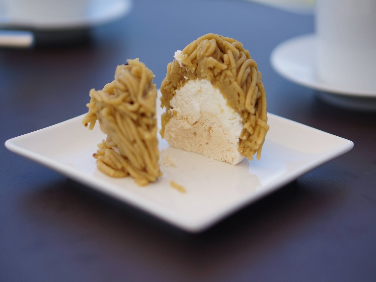 外側はマロンクリーム。栗の粒感が少し残った食感です。中心の生クリームは無糖ですが、これがまたおいしい!