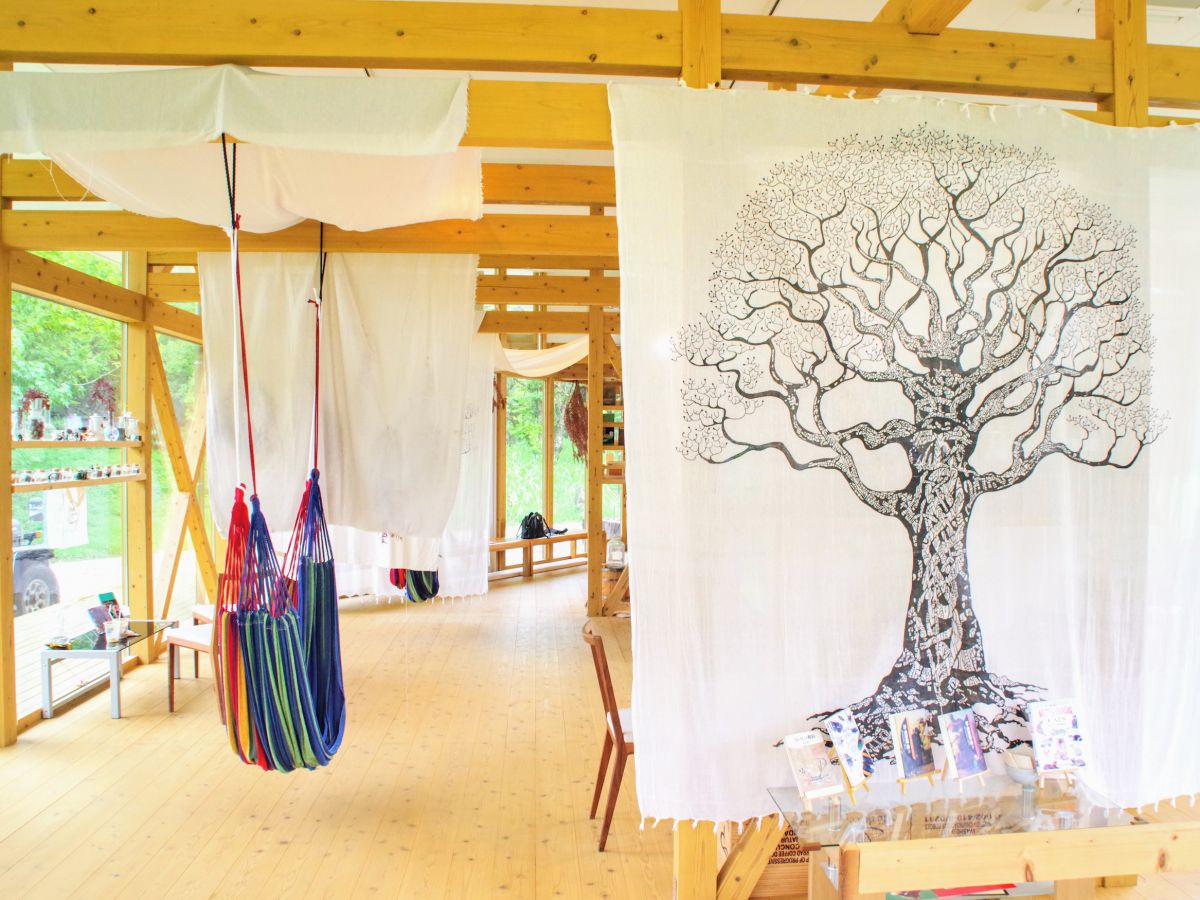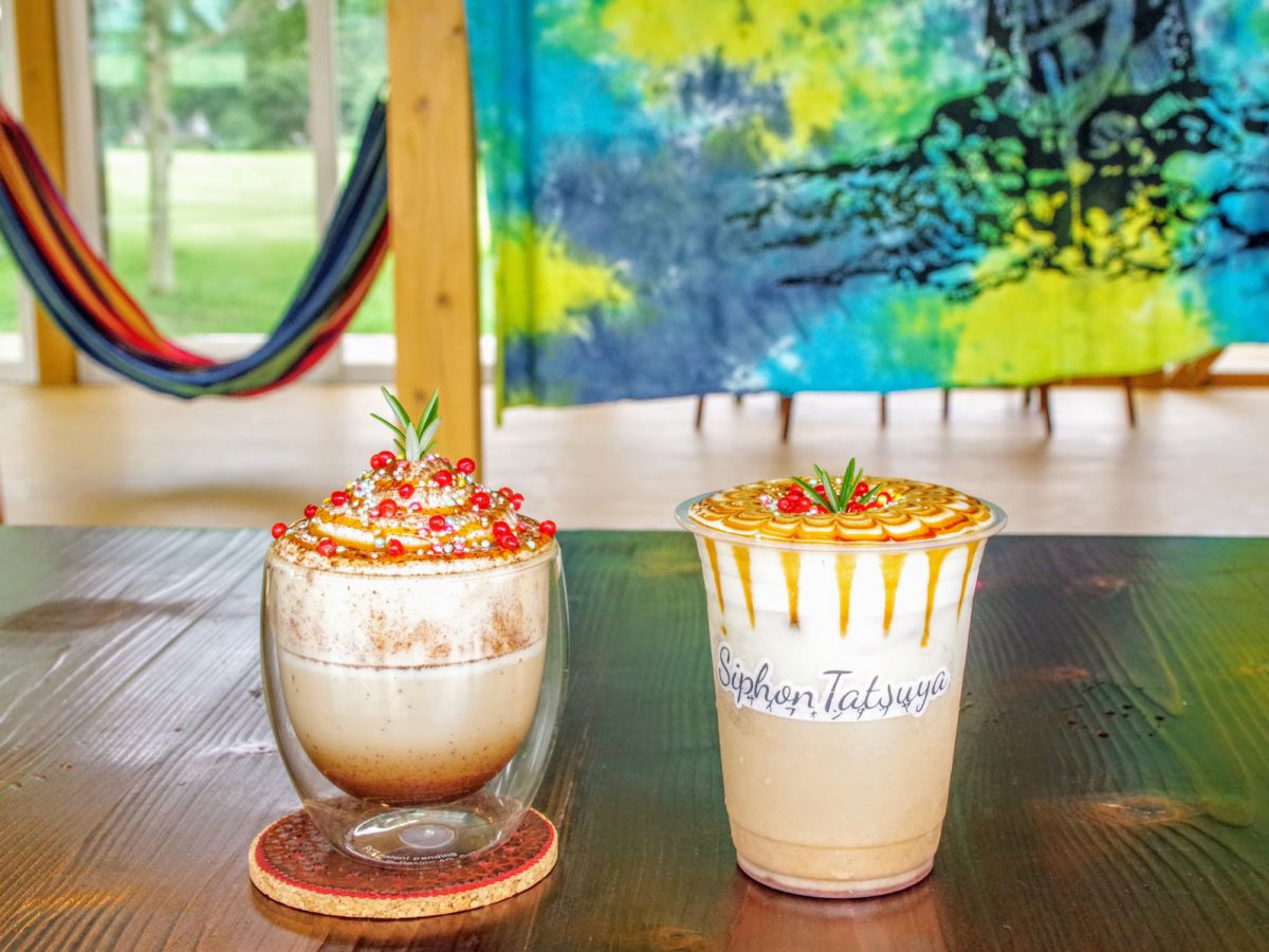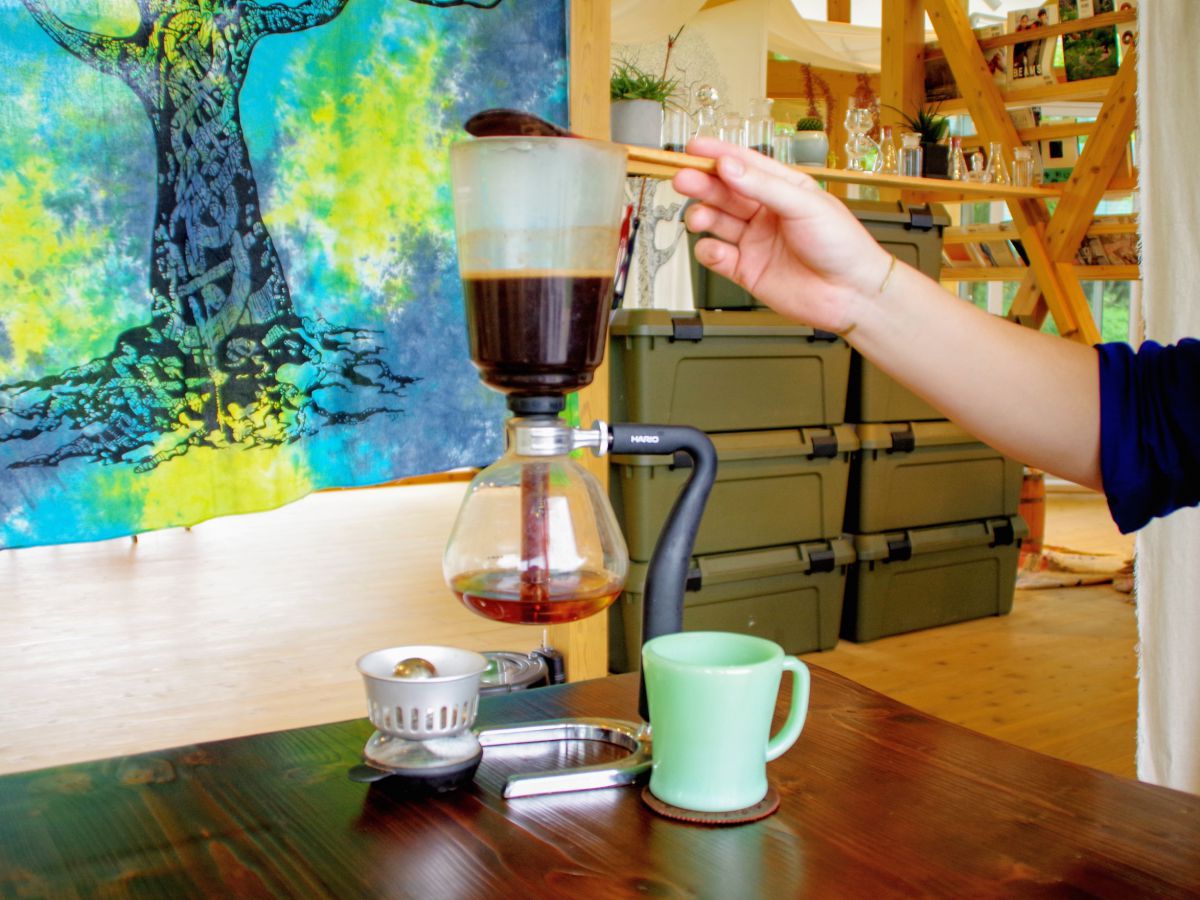 店内は木のぬくもりを感じるナチュラルな雰囲気。ソファ席やハンモックなどが設置され、リラックスしながらドリンクを楽しめるおしゃれな空間になっています。サイフォンタツヤで提供されるドリンクは、テイクアウトも可能です。天気の良い日には、公園の広場やお店のテラスでドリンクを楽しめる自由度の高さも魅力のひとつ。