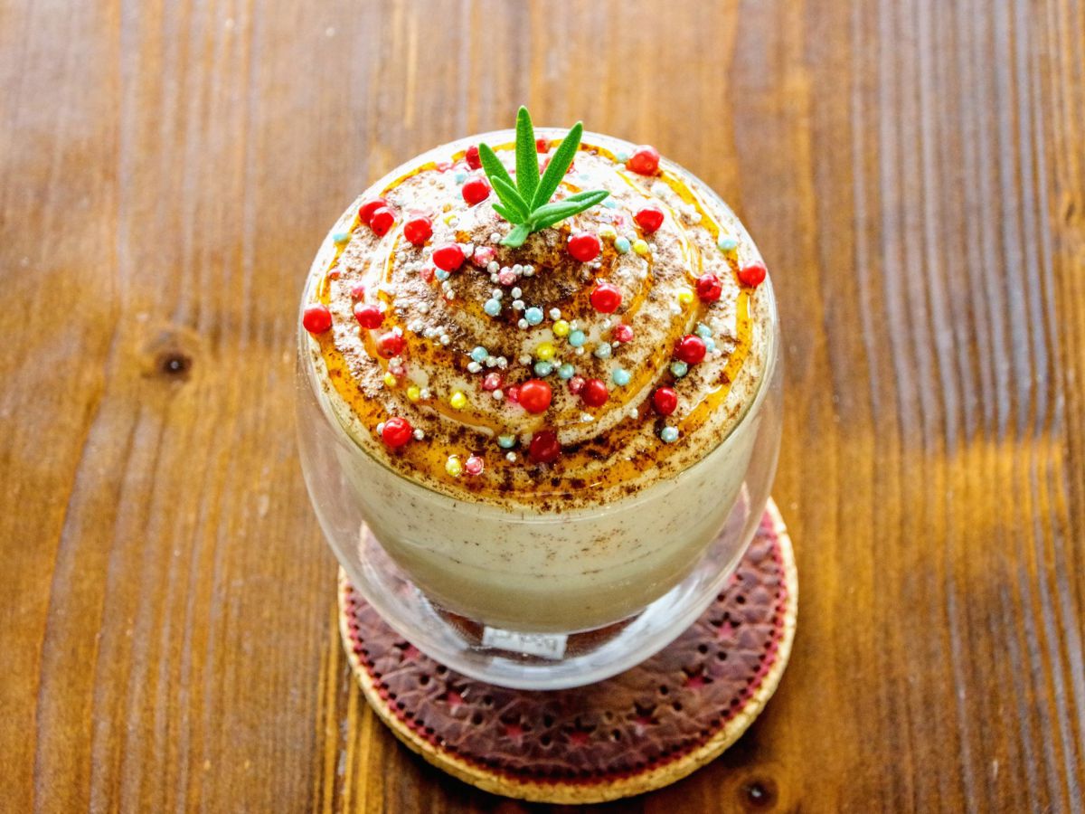こちらはジェントルチャイのホットです。泡立てられた豆乳が立体的に盛り付けられ、ピンクペッパーやアラザン、ローズマリーがクリスマスツリーのようにあしらわれています。ふんわりとした豆乳の泡をスプーンですくい、カップの底にたまったスパイスを好みに応じて混ぜ合わせながら飲みましょう。まろやかな豆乳と刺激的なスパイスが調和した、温かいスイーツのような味わいです。