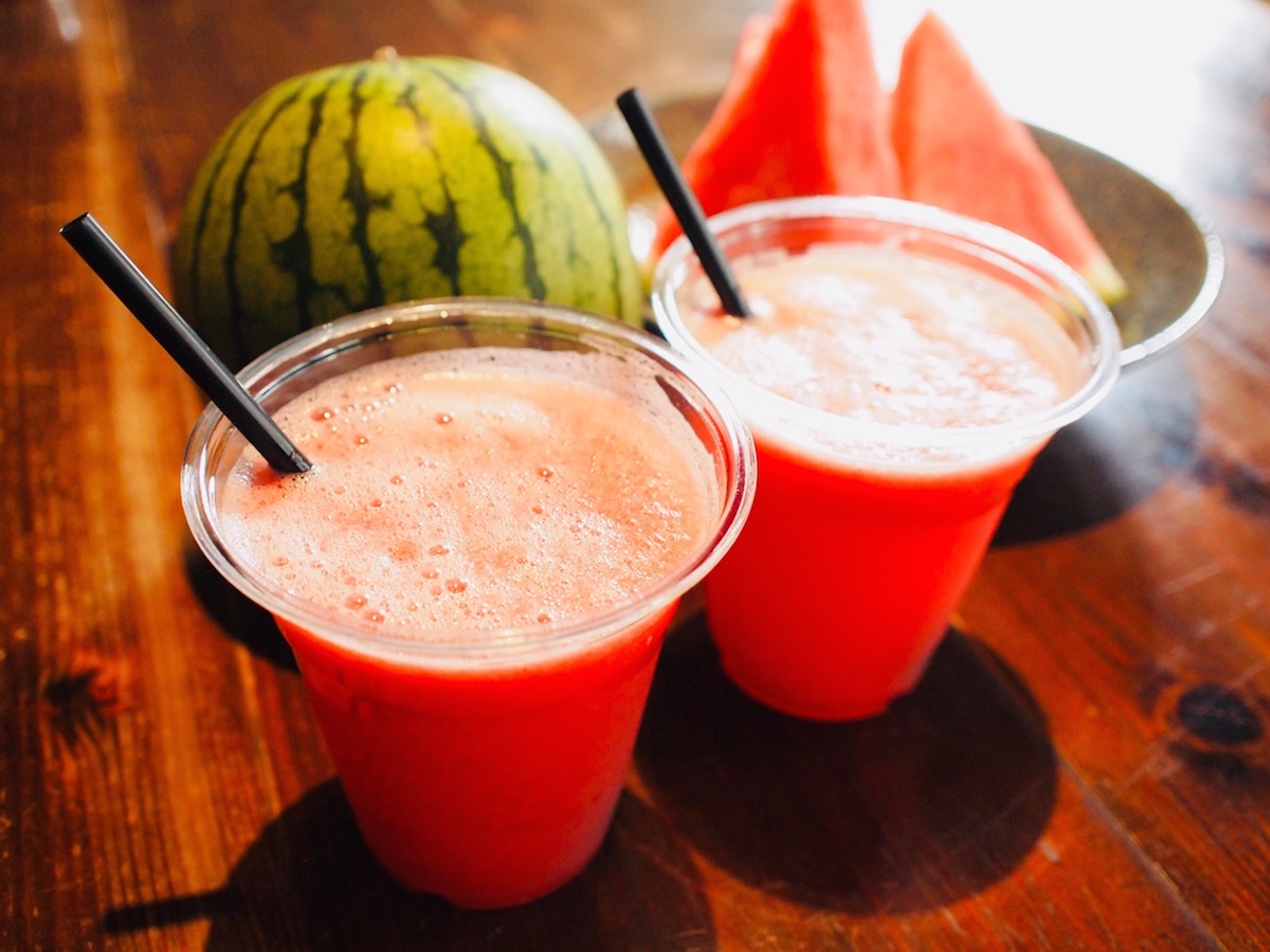 熱気ムンムンの会場では、ひんやり冷たい「西瓜汁(スイカジュース)」を。こちらは台湾夜市でも人気の定番ドリンクです。