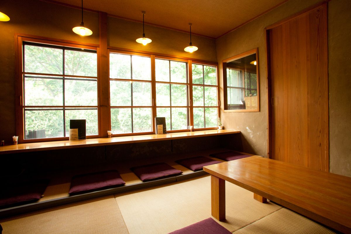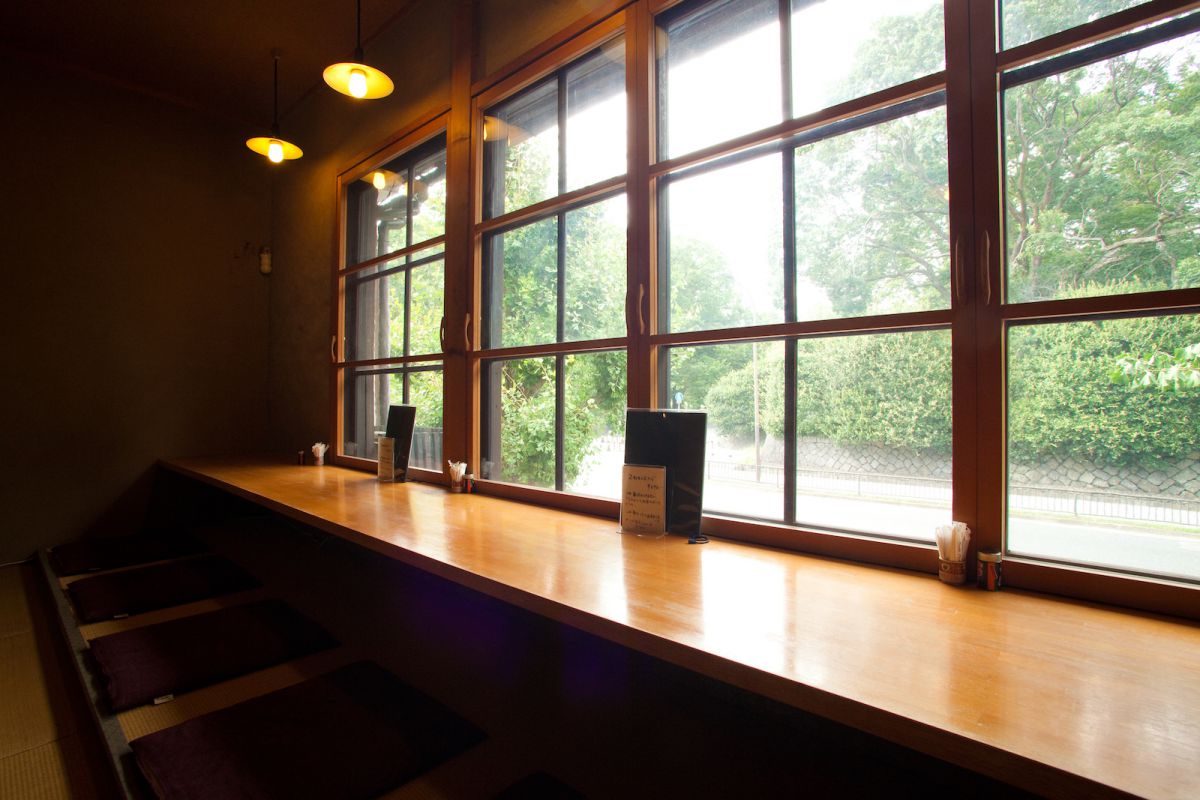 揺らぎガラスの向こうの、京都御苑を囲む緑が目を休ませてくれます。以前は事前にハガキでの申し込みが必要だった京都御所ですが、いまでは通年無料で一般公開されるようになりました。おそばでお腹を満たした後は、御苑や御所を散策するのもいいですね。秋は紅葉、春は梅、桃、桜を観賞できます。