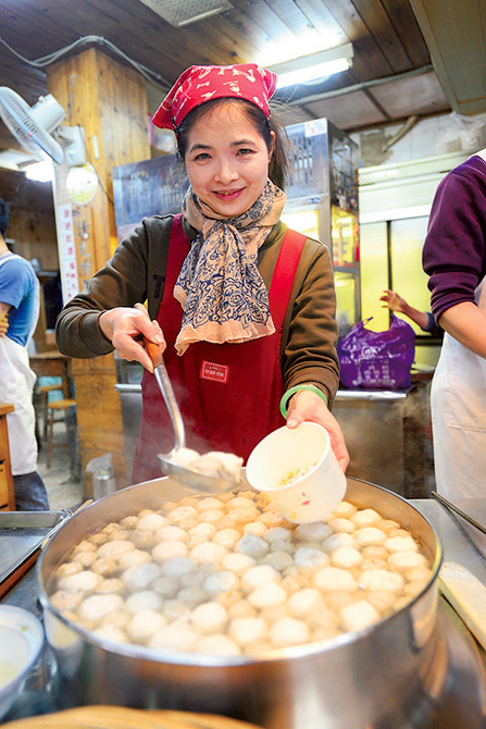 もちもち食感が格別な九份名物芋圓の店。夏はかき氷にON、冬ならお汁粉にIN。多い日には1日1000杯も売れるそう。高台にあるので景色も抜群、最高のごちそうです! 絶景を見ながら総合冰(NT$50)をぜひいただいてくださいね。