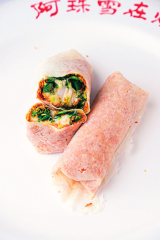 薄焼きクレープの中に、タロイモアイスとピーナッツ入り麦芽糖を包んだスイーツが名物。食べやすいよう、半分に切ってもらうこともできます。