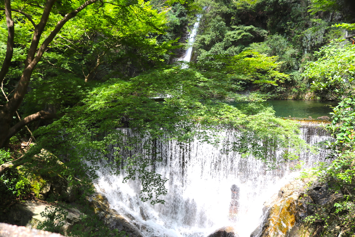 鼓ヶ滝からさらに5分奥へ進むと、ついに夫婦滝と雄滝が目の前に! 手前の、二俣に分かれている滝が夫婦滝、奥にあるのが雄滝です。