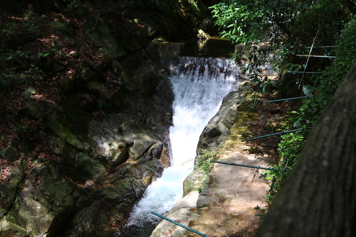 分岐地点から徒歩5分程度ですぐに雌滝へと到着。ザァーッと流れる水の勢いが間近に感じられ、時間を忘れてリラックス♪ 周りには木々が生い茂り、ここが神戸市内であることを忘れてしまいます。