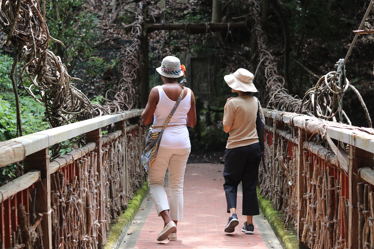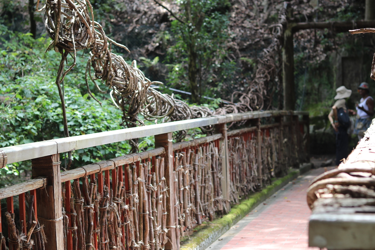 展望台を過ぎ、さらに奥へと進むと「猿のかずら橋」が見えてきます。ここは六甲山の森林をよりよく保とうという願いを込めて、ツルで装飾を行なった橋。周りの森林とツルの大胆な表現が相まって、なんだかアニメ映画の世界に迷い込んだようです。