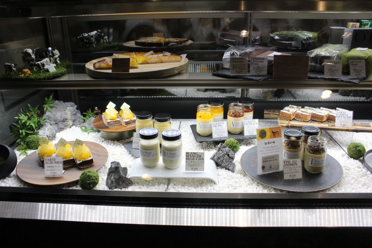枯山水をイメージした和の庭園風のショーケースの中には、瓶スイーツ、タルト、ショートケーキ、テリーヌなどが並びます。こうして並べられていると、ケーキ一つひとつもまるでアート作品のようです。