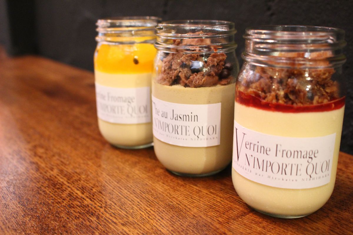 見た目にもおしゃれな瓶入りスイーツは全部で5種類。北海道産の濃厚な牛乳と、錦市場に店を構える三木鶏卵の卵を使ったシンプルなプリン「クレーム・カラメル」(写真右から2番目・380円)をはじめ、チャイのような味わいの「ジャスミンティーのクレーム」(写真左端・530円)、香りのよい宇治産の特上ほうじ茶を使った「ほうじ茶ブランマンジェ」(写真中央480円)などがあります。