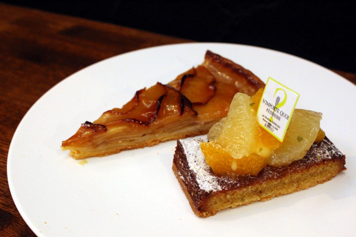 「かんきつ類のタルト」(写真手前・500円)は、ピスタチオとアーモンドを使ったコク深い生地と、かんきつ類のフレッシュさが絶妙に合わさった一品。レモンクリームが間に挟まり、さっぱりとしたあと味です。