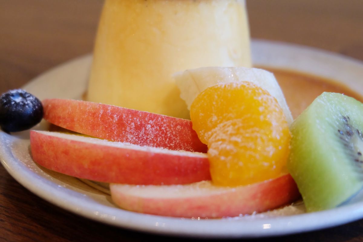 単品のプリンにもフルーツ・生クリームが添えられていて、まるでプリンアラモードのような盛り付けのひと工夫にキュンとします。