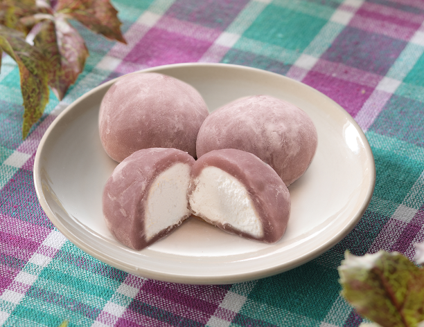 大福の皮にブドウピューレを練りこみ、中はクリームがたっぷりの「ぶどう大福」。