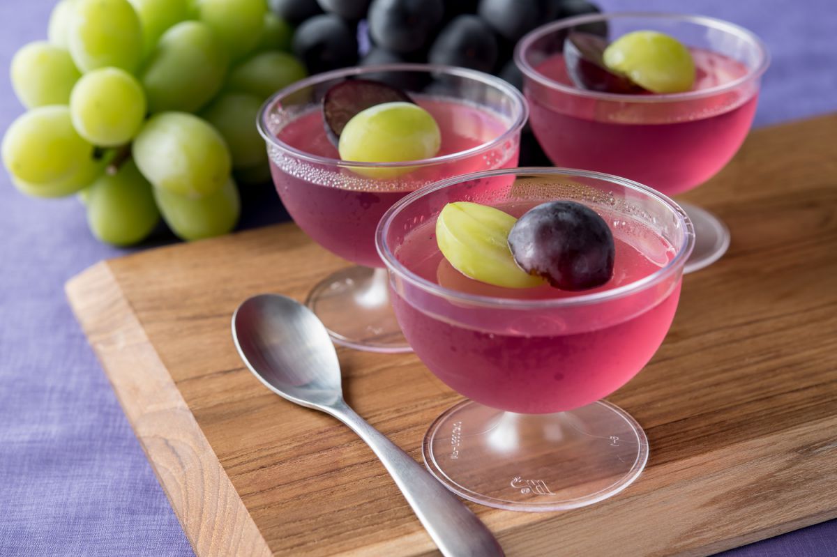 ブドウ果汁を入れたゼリーをクラッシュして、ブドウの果肉をトッピングした「巨峰ゼリー」。