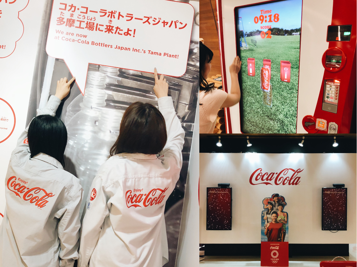 ほかにも、工場で働いている人が実際に着用しているユニフォームを借りておそろコーデをしたり(写真左)、タッチパネル式の自動販売機でゲームを楽しんだり(写真右上)、コカ・コーラのロゴの左右にあるスクリーンの前に立つとおもしろい仕掛けが楽しめるコーナーがあったり(写真右下)。