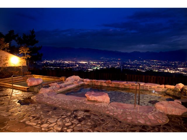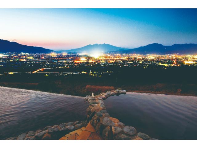 甲府盆地の大パノラマが見渡せる絶景露天風呂が自慢です。特に夜景は煌びやかで、温泉では全国初の夜景100選に認定されています。夕暮れ時から夜に移りかわる瞬間がオススメですよ。