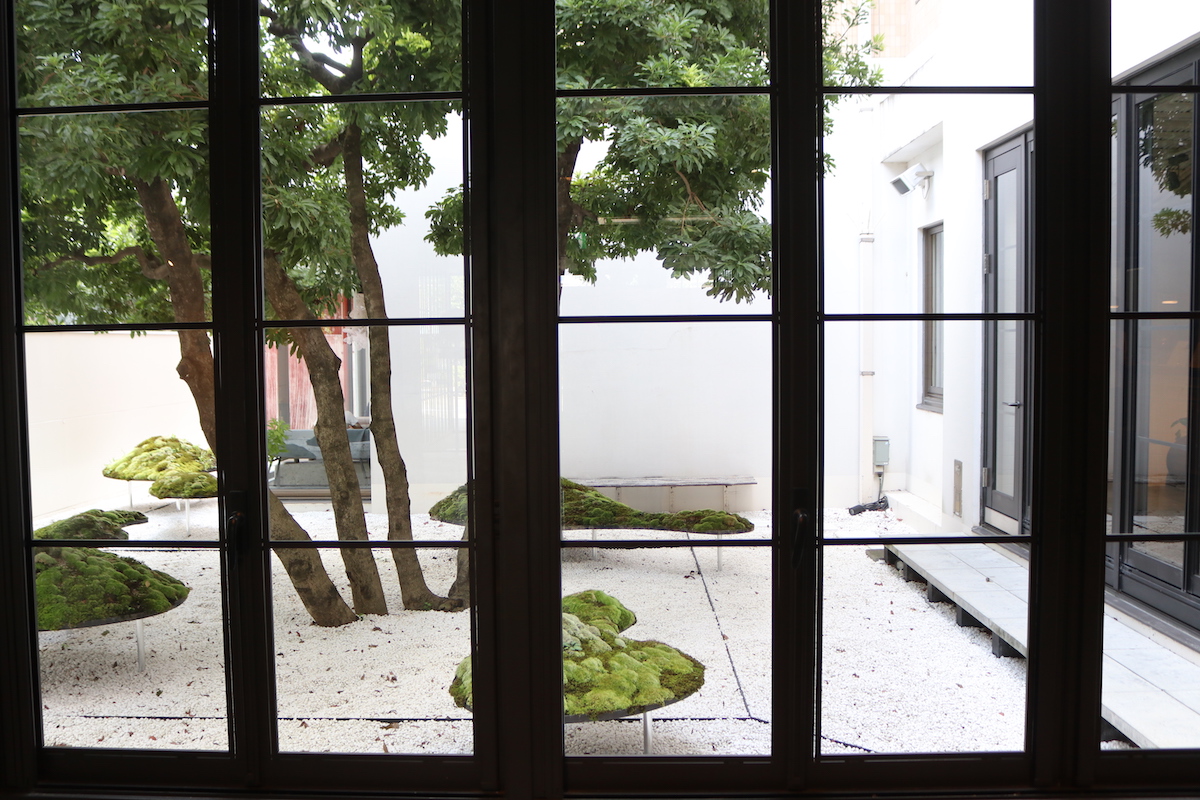 中庭にある苔山は、京都御所の中にある池がモチーフ。浮遊感のある不思議なデザインで、思わず目を奪われます。このように細かなディテールまでアートと結びつき、敷地全体を通して奥深い仕掛けがなされているのがこのホテルの特徴です。