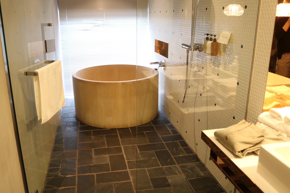 さらに、青森ヒバの木を贅沢に使った大きな浴槽も設えられ、庭を眺めながらゆっくりくつろぐことも可能。部屋での滞在時間をとことん楽しめるよう、あちこちに工夫が施されています。