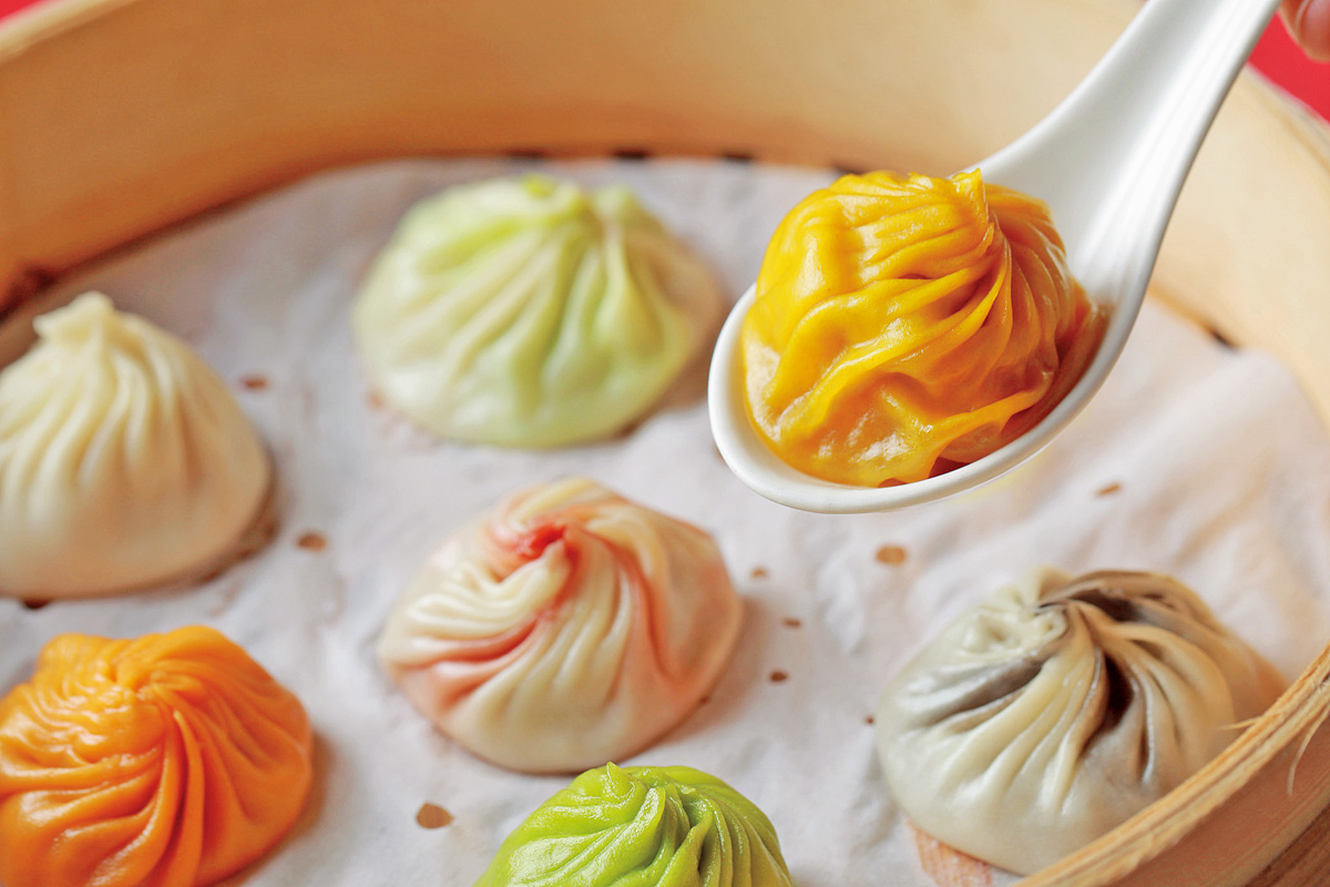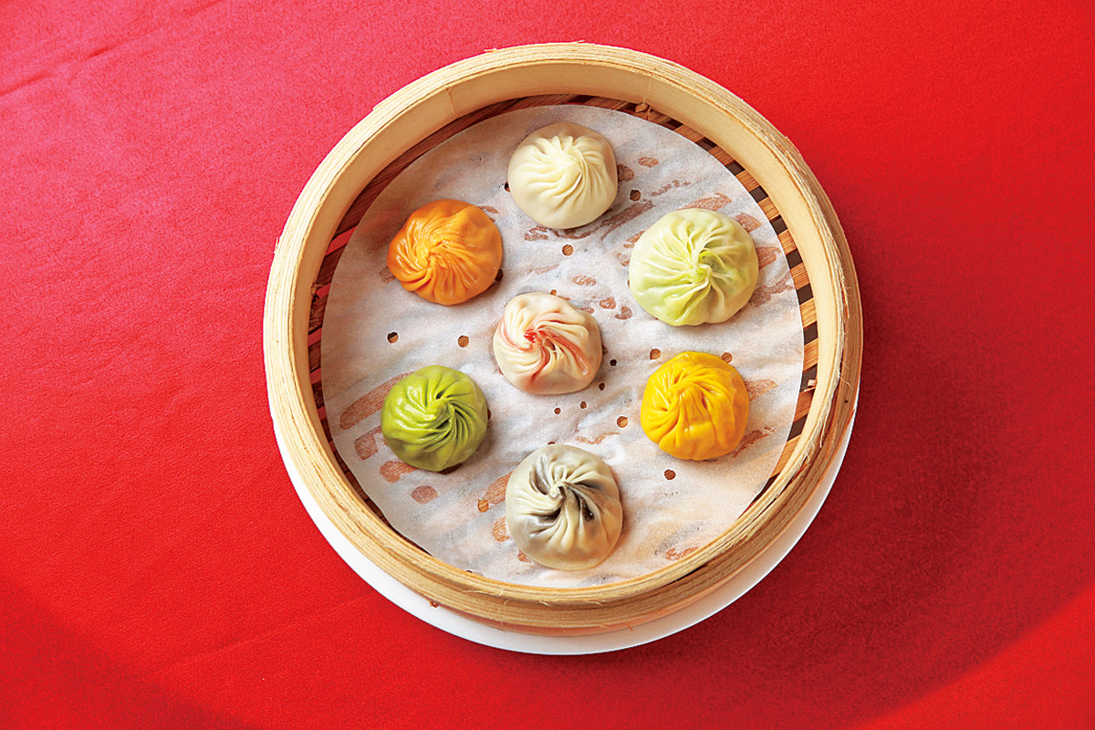 天然蔬果原汁七彩小籠包NT$380(7個)はカニ味噌、台湾バジル、麻辣など7味の小籠包。カラフルな皮は野菜や果汁などで色付けられています。