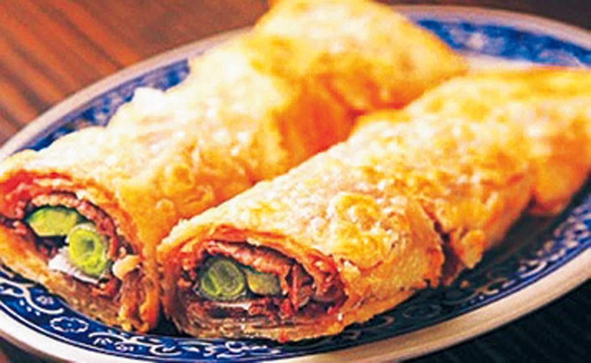 一緒に頼みたい大餅捲牛肉NT$150は牛肉やキュウリ、甜麺醤を葱油餅で巻いたもの。
