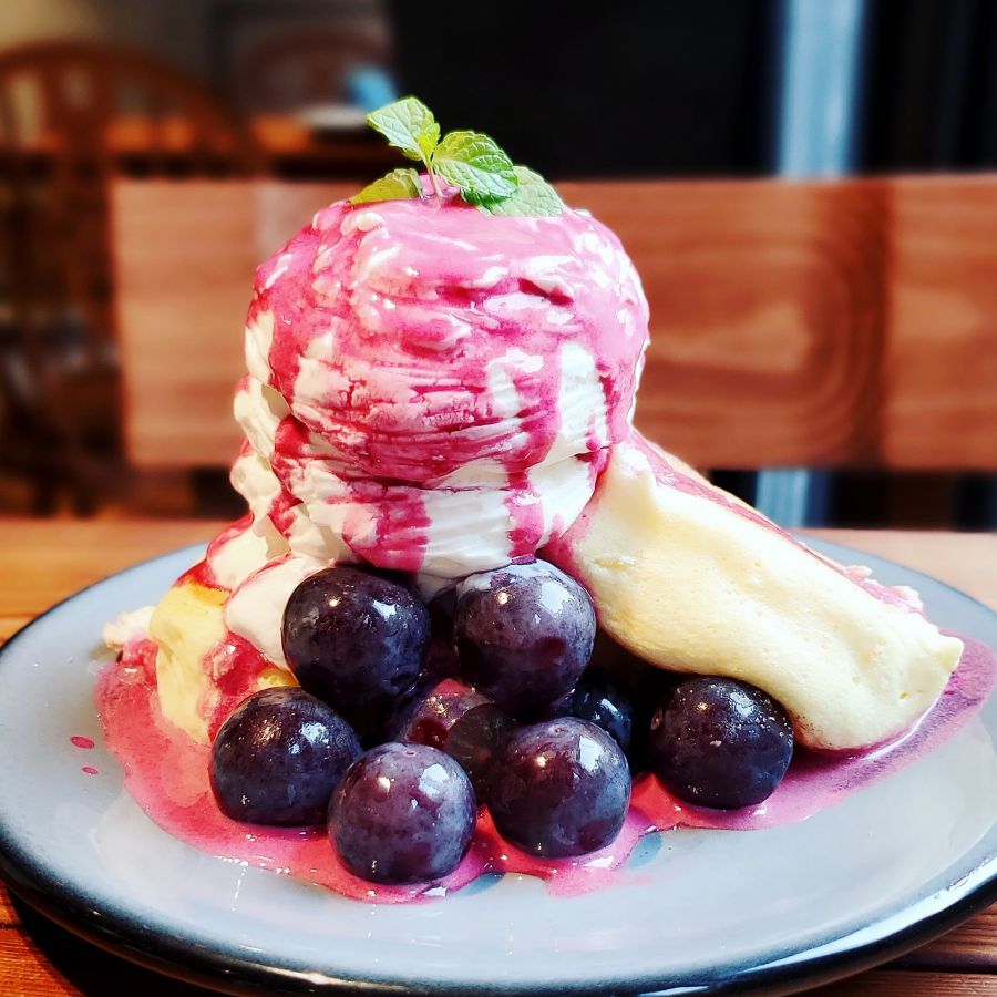「ESPRESSO D WORKS」と言えばふわふわパンケーキが人気ですが、もちろん池袋店でも味わうことが出来ます。 写真は、2019年9月の限定「ピオーネぶどうのパンケーキ1580円」 大粒のピオーネたっぷりに、巨峰アイスと赤ぶどうソースで旬のぶどうを満喫出来るひと皿です。