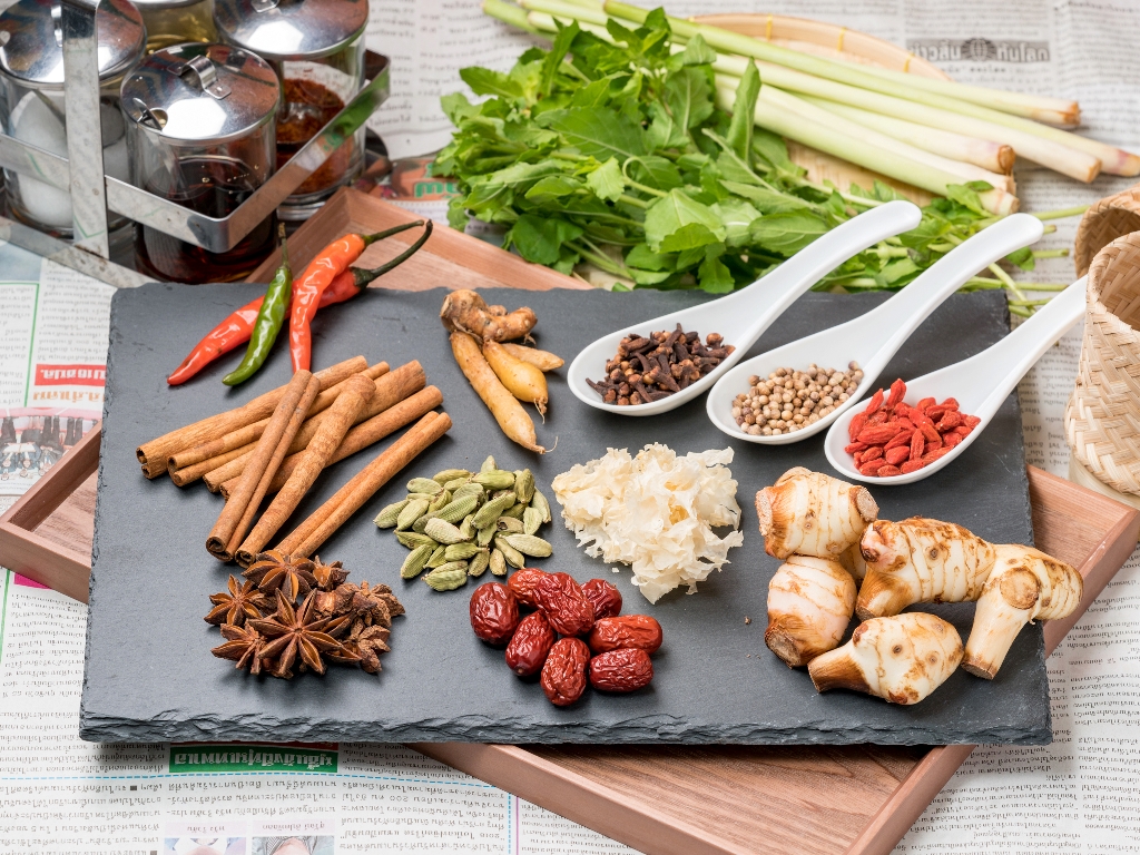 野菜を茹でるスープは、タイウコン「クラチャイ」、タイショウガ「カー」などタイ薬膳やナツメ、桂皮等の入ったコラーゲン薬膳スープでとってもヘルシー!