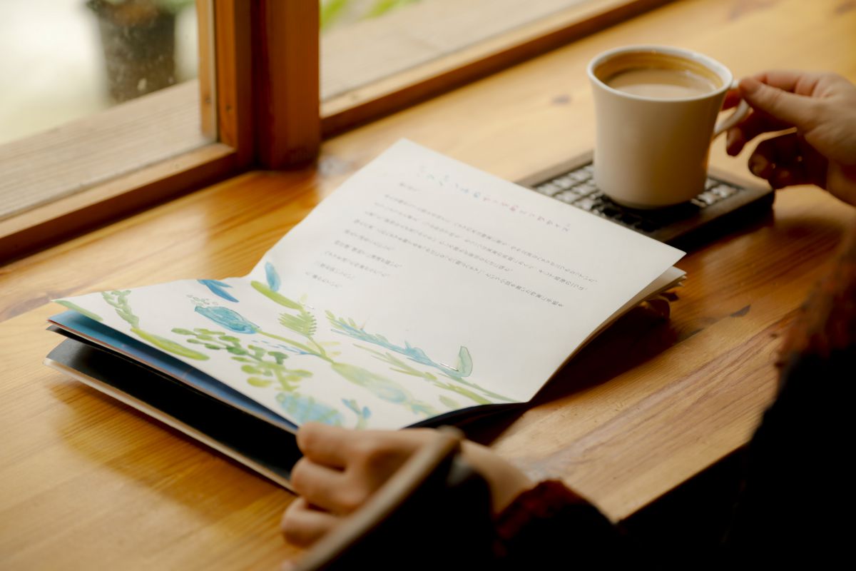 手作りの絵本を眺めながら優雅なカフェタイムを楽しんで