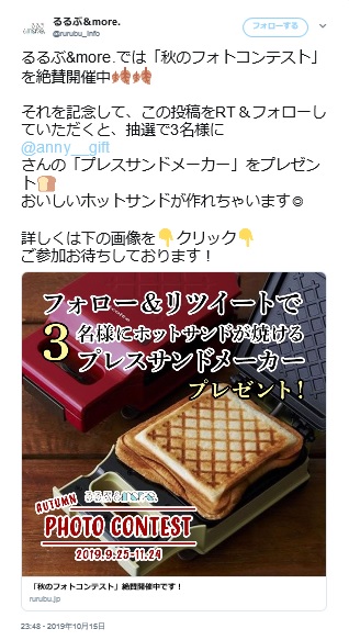 Twitterは「@rurubu_info #rurubuautumn #rurubuandmore #repostrurubu」を投稿テキストの最後に付けて応募してください。