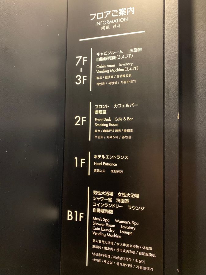 フロントとカフェが2F、地下には大浴場やシャワールーム、コインランドリーのほか宿泊者専用ラウンジがあります。