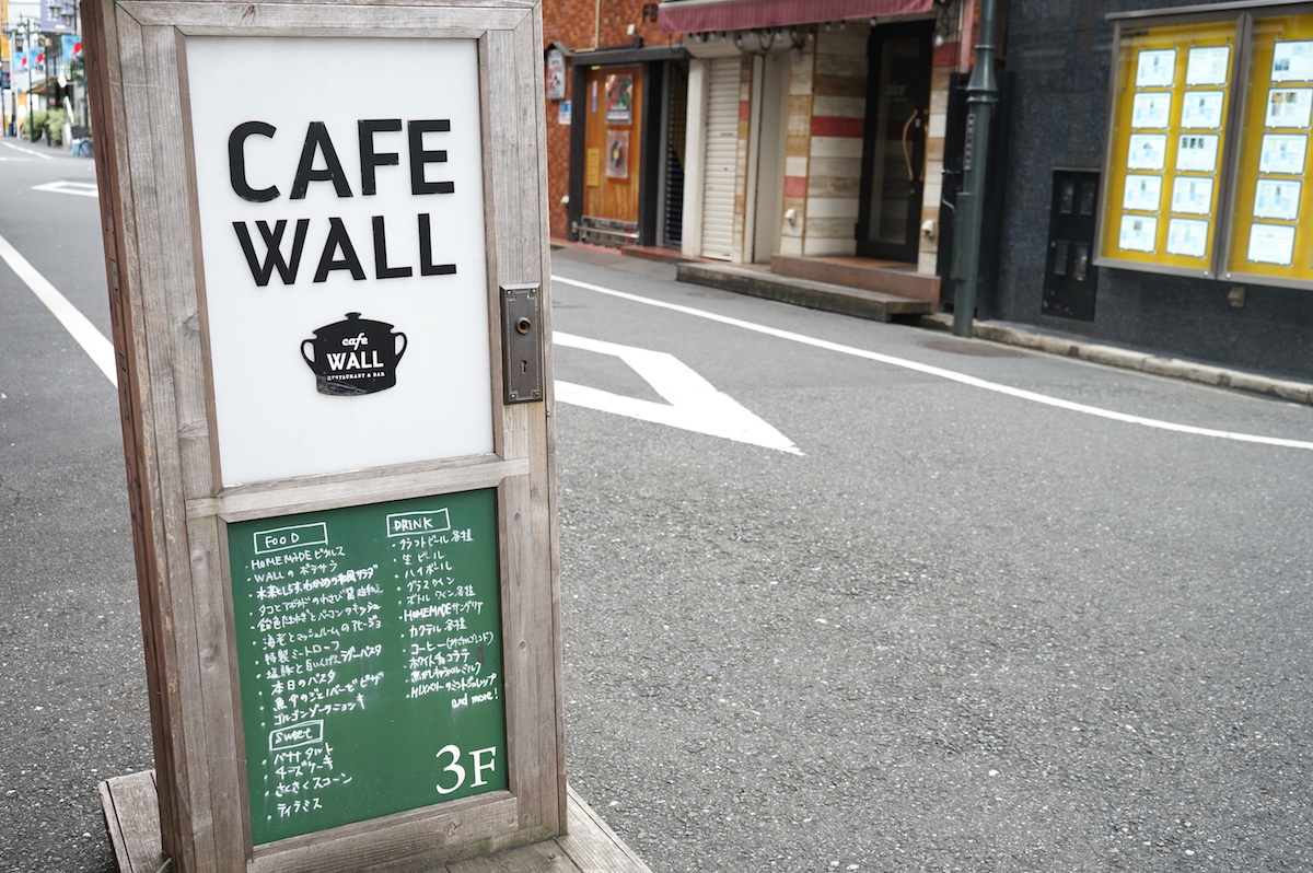 「cafe WALL」があるのは、大通りをそれた細い路地の一角に建つ、雑居ビルの一室。エントランス前の看板が目印です。