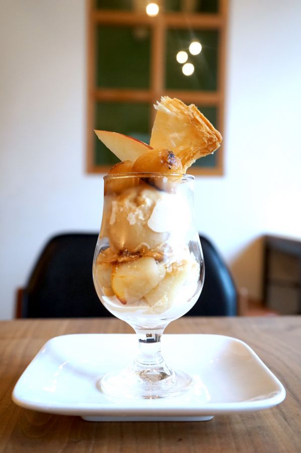 華やかにアールグレイが香るクリーム、自家製りんごコンポート、砕いたパイ、濃厚なキャメルソースとキャラメルアイスが順に重ねられています。