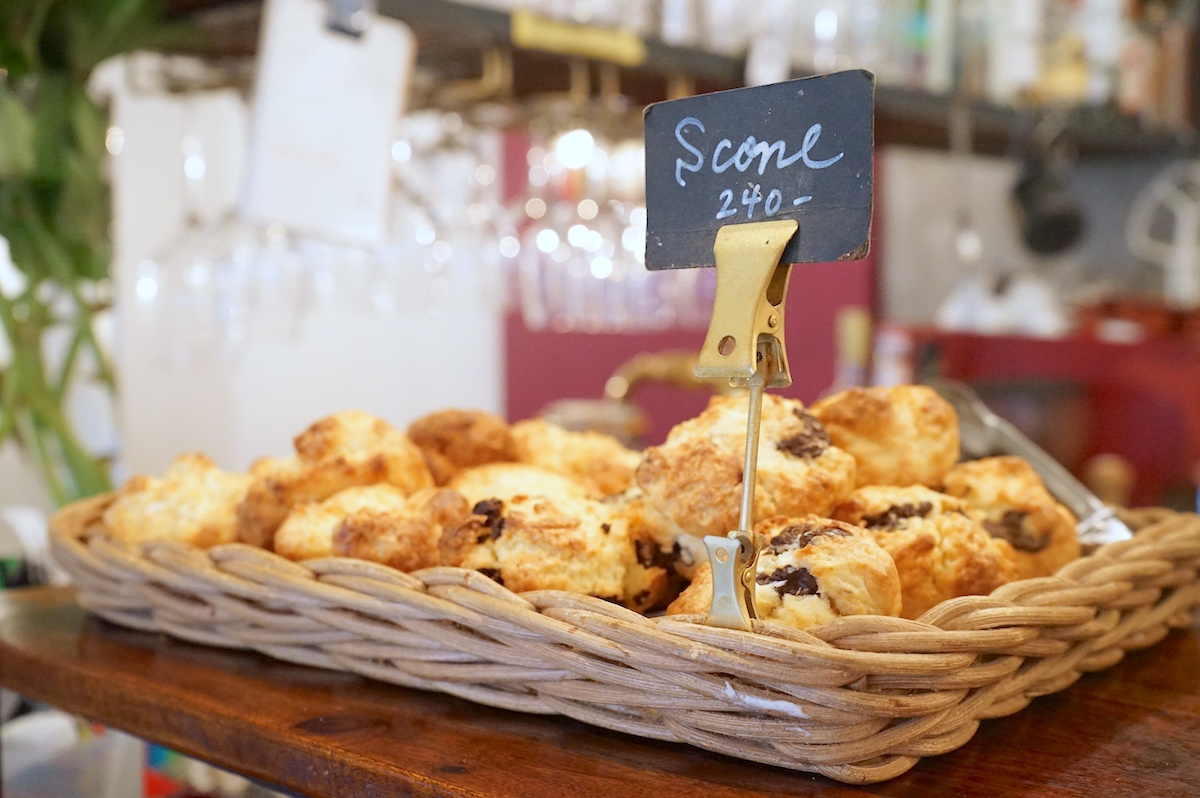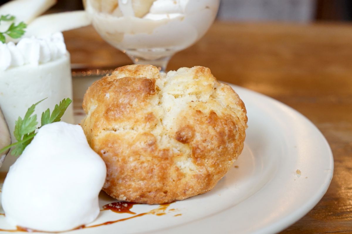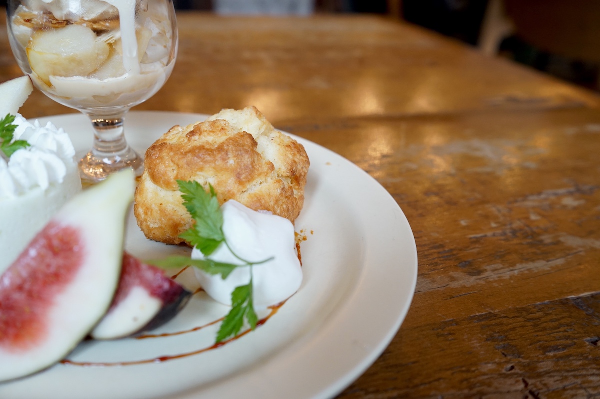 そして「cafe WALL」の定番人気スイーツのひとつ「サクサクスコーン」は、軽く温められ、生クリーム添えで登場。