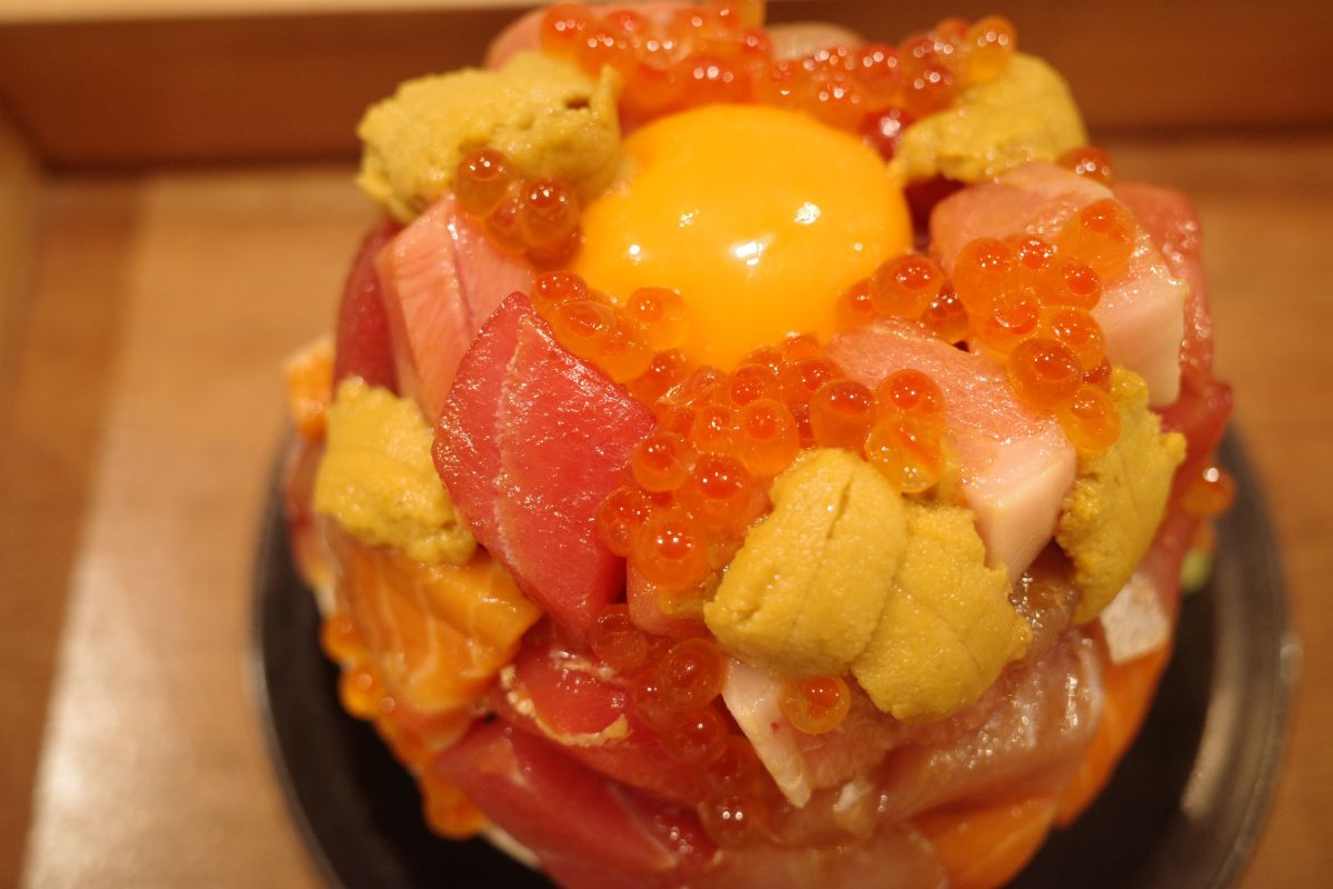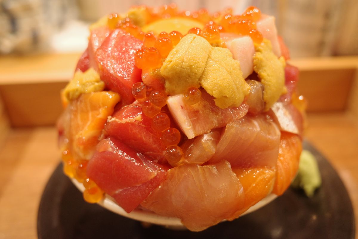 1つの丼で、うにやいくら、まぐろやサーモンなど何種類ものお魚が楽しめます。まさに宝石箱のような丼ですね。